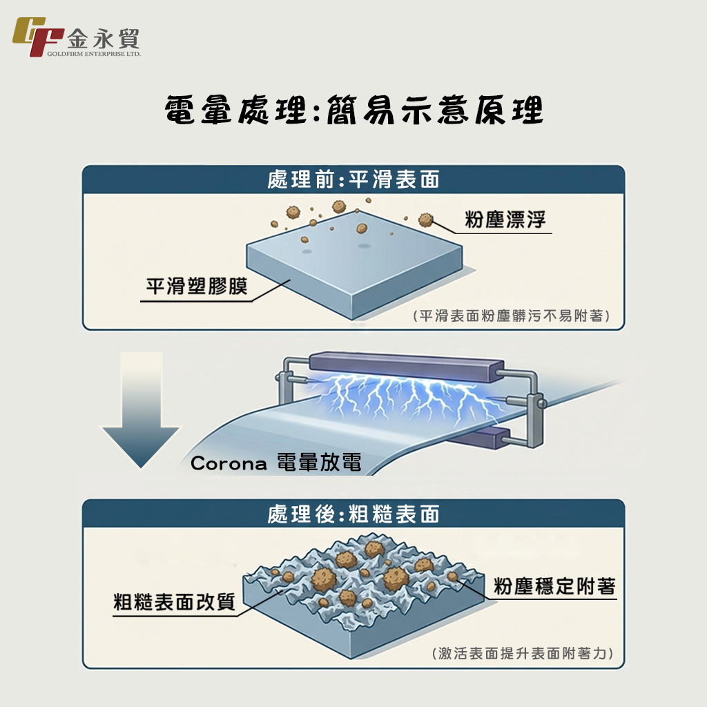 Corona電暈處理是一種「電擊」處理,通常作為表面改質的手段,透過高壓放電的方式,增加基材的表面粗度,提升基材表面的附著性。一般的塑膠膜表面很光滑,漆料、粉塵其實很難附著上去,經過Corona電暈處理後,原本平滑的塑膠膜表面有了表面粗度,進而提升了更佳的附著能力。(參考資料: 電暈處理)
